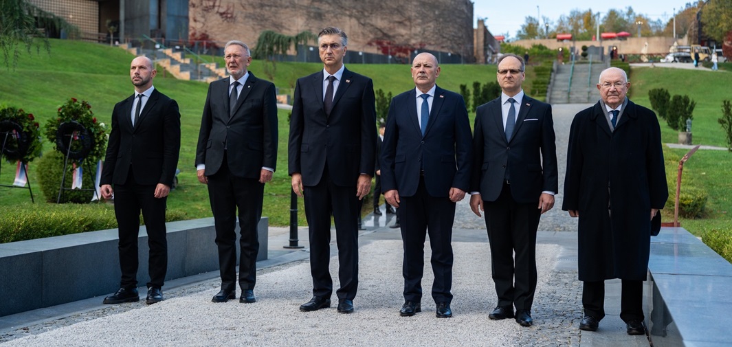 Uz premijera su bili potpredsjednik Vlade i ministar hrvatskih branitelja Tomo Medved, potpredsjednik Vlade i ministar unutarnjih poslova Davor Božinović, ministar pravosuđa, uprave i digitalne transformacije Damir Habijan, predstojnik Ureda predsjednika Vlade Zvonimir Frka-Petešić i posebni savjetnik predsjednika Vlade Mate Granić.