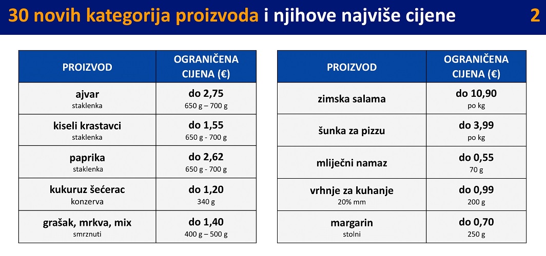 Kruh miješani nepakirani (ograničena cijena do 1,70 eura po kg), pecivo lizika (do 0,69 eura po komadu), listovi za pite i savijače (do 1,23 eura 500 grama), tost (do 1 euro 400-500 grama), petit suhi keksi (do 2,49 eura za kg), lignje smrznute (do 4,49 eura za 400-500 grama), špinat smrznuti (do 1,99 eura za 400-600 grama), njoki do 1,29 eura 400 do 500 grama), čokolada za kuhanje (do 4,2 eura 200-400 grama), majoneza u vrećici (do 0,75 eura 80-85 grama) …