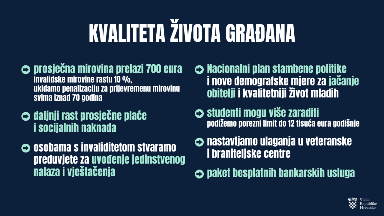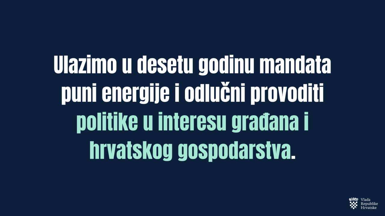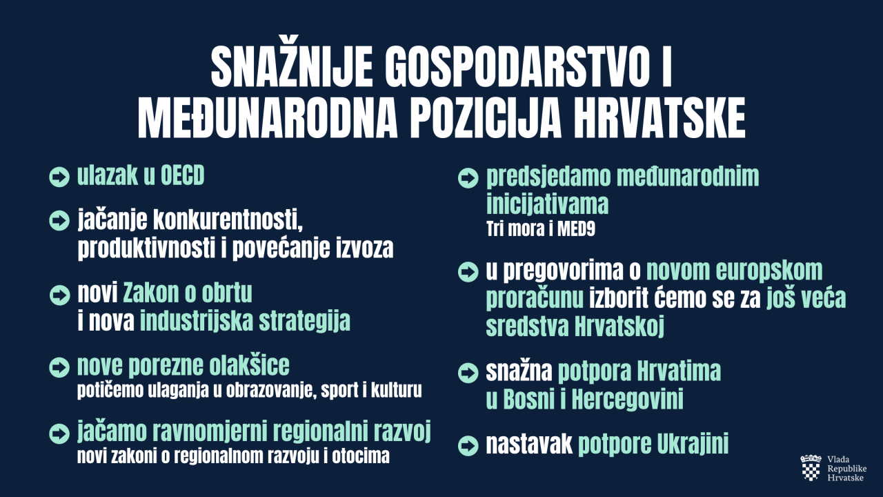 - Pred nama su, iako su u 2025. godini već bile rekordne, dodatne demografske mjere u cilju jačanja hrvatske obitelji, daljnje podizanje životnog standarda i ulaganja u obrazovni sustav, ulazak u OECD, osiguravanje priuštivog stanovanja te nastavak brige o umirovljenicima, studentima, osobama s invaliditetom i braniteljima.