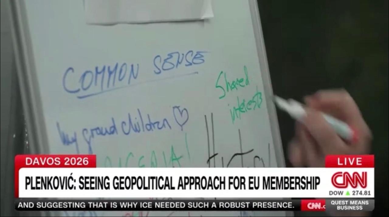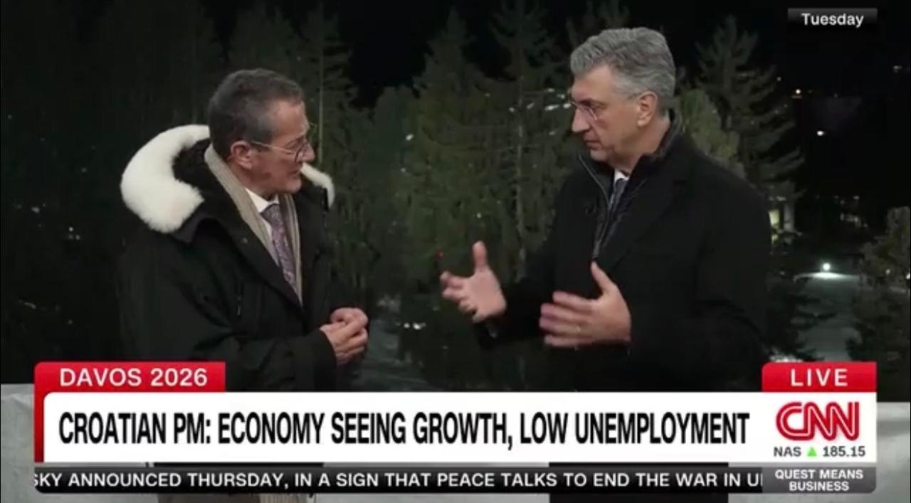 (VIDEO) U intervjuu koji je na WEF-u u Davosu dao na engleskom jeziku uredniku Richardu Questu PVRH/PHDZ Andrej Plenković govorio je o budućnosti NATO-a, Donaldu Trumpu i Ukrajini. Osvrnuo se i na ekonomsko stanje u našoj zemlji („Hrvatska raste - Visoka zaposlenost, a niska nezaposlenost!“) te proširenje EU-a („Ubrzati europski put BiH - u kojoj su Hrvati konstitutivni narod!“). Na ploči je, u 2 riječi, napisao što mu daje nadu u ovom vremenu vrlo zahtjevnih globalnih izazova.