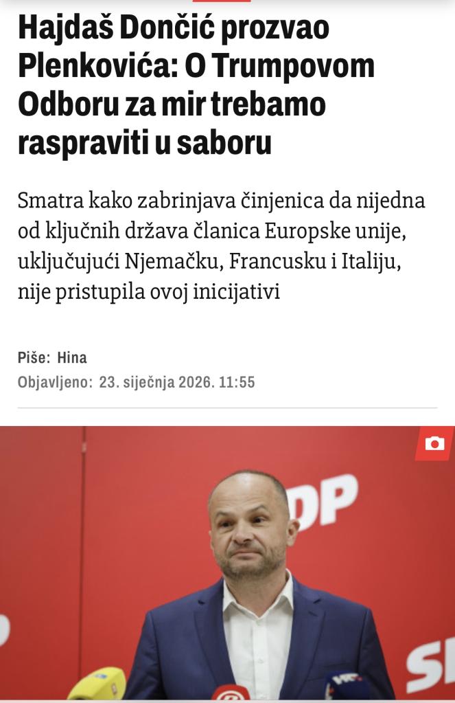 - Primili smo ga na znanje. Pretpostavljam da bi Hajdaš htio znati zašto premijer Plenković nije istog trena odbio pridruživanje Odboru za mir. Odgovor je jednostavan - sagledava geopolitički kontekst i postupa kao državnik, racionalno i zdravorazumski.