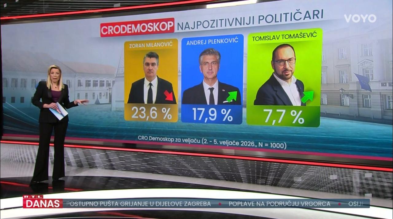 Prvi ovogodišnji CRO Demoskop. HDZ je u veljači i više nego uvjerljivo prvi izbor s 30,6%. U zadnjoj prijašnjoj anketi (u prosincu 2025.) imali smo „samo“ - 27,5%. Prema novom istraživanju za RTL Danas, premijer i predsjednik HDZ-a Andrej Plenković ostvario je još strelovitiji rast popularnosti (pozitivnog dojma), i to nakon odlučnog, državničkog poteza - preuzimanja organizacije dočeka rukometne reprezentacije u glavnom gradu! To je „skok“ od nezapamćenih 6,4 postotnih bodova!