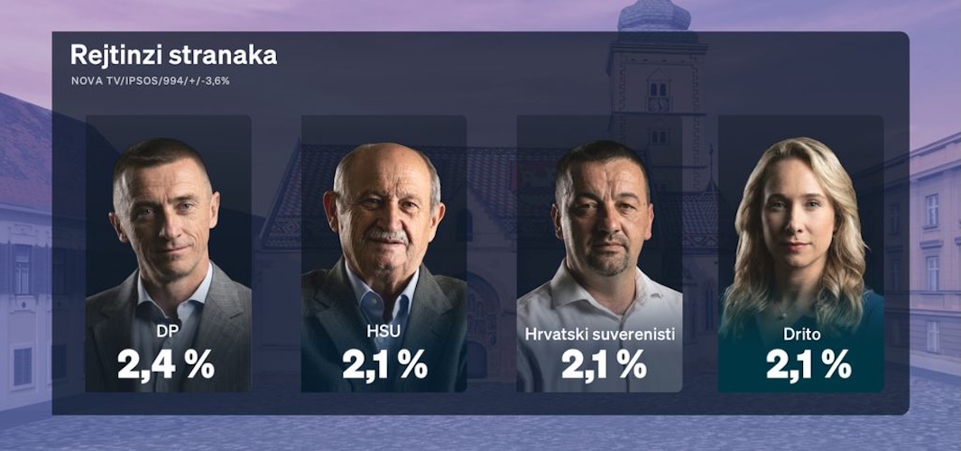Isti rejting kao HSU drže Hrvatski suverenisti i stranka Drito (bračni par Selak Raspudić). Sve ostale stranke su na manje od 2% podrške.