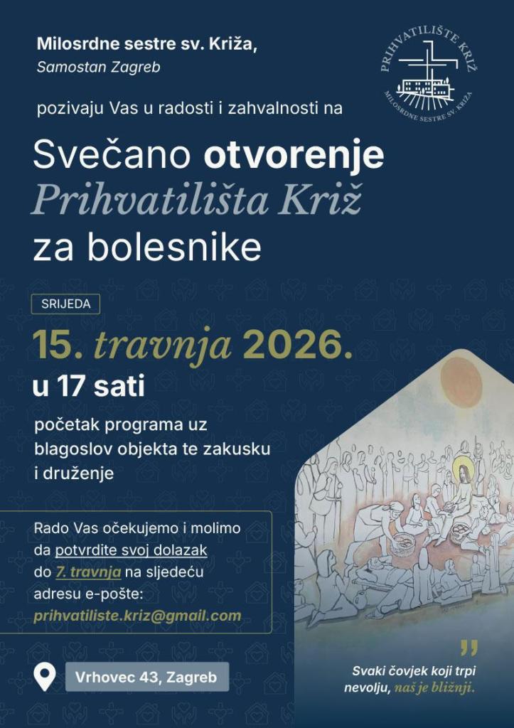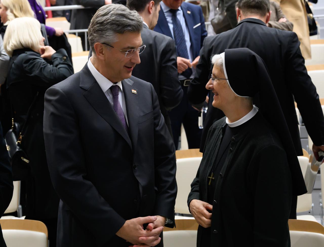 Premijer Andrej Plenković na svečanom otvorenju Prihvatilišta za bolesnike „Križ“ na zagrebačkom Vrhovcu. U njemu će besplatni smještaj moći dobiti onkološki pacijenti, odrasli i djeca, koji u glavni grad dolaze na liječenje iz svih krajeva Hrvatske. „Izuzetno nam je drago da je naša Vlada RH, na poziv Milosrdnih sestara Svetoga Križa, pridonijela ovome i zdravstvenom i socijalnom projektu. Iskrene čestitke na neizmjernoj volji i želji da činite dobro - što je i poslanje vaše redovničke družbe“.
