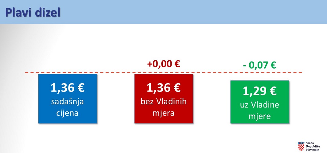 (VIDEO) Premijer Andrej Plenković na 161. sjednici Vlade RH: „Eurodizel i plavi dizel pojeftinjuju 7 centi po litri, a eurosuper 2. Da se cijene slobodno formiraju na tržištu, u maloprodaji bi litra dizela bila skuplja 0,21 €, eurosupera 0,10 €, a plavog dizela 0,07 €! Kao u svim krizama do sada, čuvamo socijalnu koheziju, štitimo hrvatske građane i gospodarstvo“. Osim što je snizila cijene svih goriva i UNP-a, Vlada je usvojila dopunu Zakona o PDV-u te je uputila u Hrvatski sabor po hitnoj proceduri.