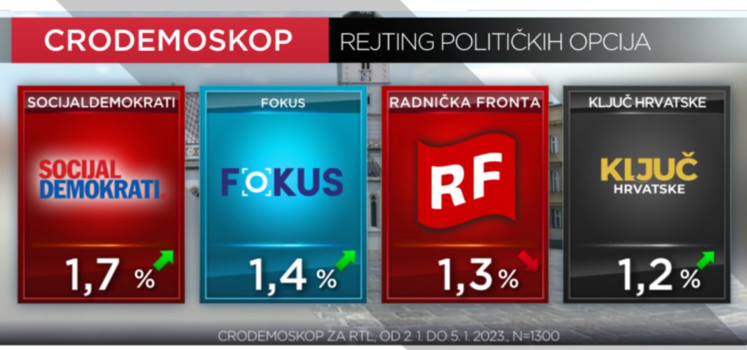 Slijede Socijaldemokrati (1.7%), Fokus (1.4), Radnička fronta (1.3), Ključ Hrvatske /bivši Živi zid/ i HSS (po 1.2).