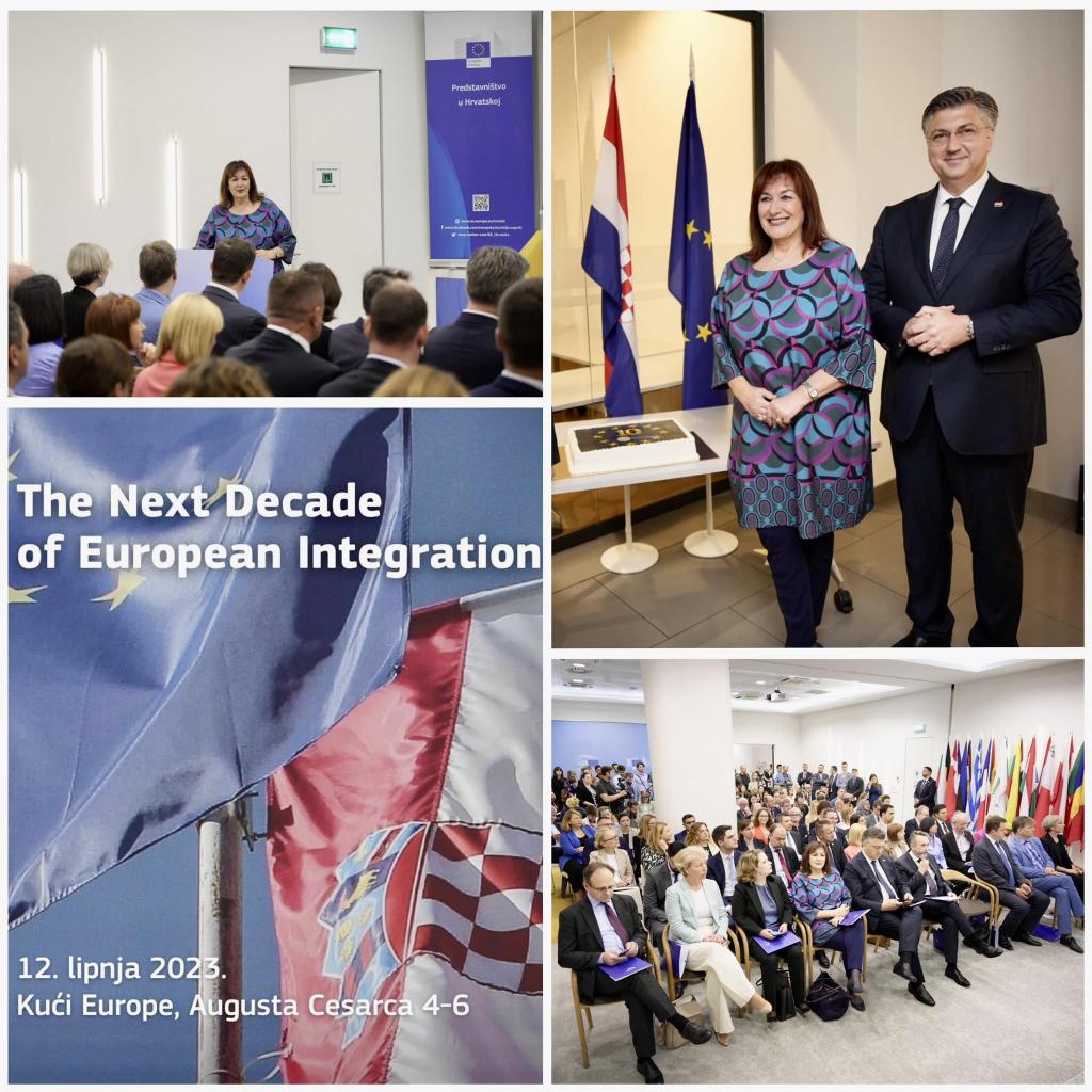 Kuća Europe u Zagrebu. PVRH Plenković na konferenciji „Sljedeće desetljeće europske integracije“ u povodu 10. obljetnice članstva RH u EU-u (1. srpnja 2013.): Nastavit ćemo učinkovito koristiti EU sredstva - koja su zamašnjak razvoja Lijepe Naše. No Europska unija nije samo novac, kako to neki tvrde, nego je i zajednica prava i demokratskih, civilizacijskih vrijednosti koje dijelimo. Stoga želim još jednom zahvaliti dr. Franji Tuđmanu i hrvatskim braniteljima koji su u iznimno teškim okolnostima stvarali i stvorili hrvatsku državu. Bez njih danas ne bismo živjeli u slobodi, niti bismo bili dio EU-a. Unatoč velikosrpskoj agresiji, a u novije vrijeme i dvjema globalnim krizama, uspjeli smo doći u fazu „catching up-a“. Hrvatska lovi korak s državama koje su svoje EU procese započele još 1990-ih, dok je u nas bjesnio rat.