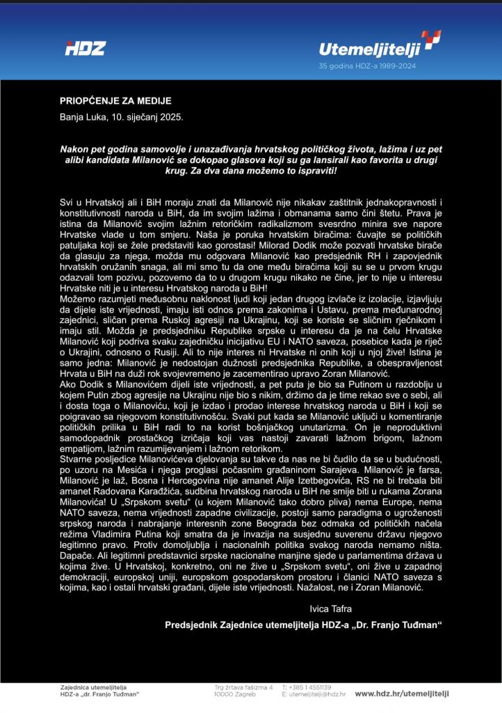 Banja Luka. Zajednica utemeljitelja HDZ-a „Dr. Franjo Tuđman“: Dodik podržava svog prijatelja Milanovića jer obojica vrlo dobro plivaju u „rusko-srpskom svetu“, dijele iste vrijednosti, isti odnos prema Ustavu, isti rječnik i stil. Milanović je prije toga u crvenom šuškavcu navijao za Komšića, ali i sada (lažnim) retoričkim radikalizmom radi u korist bosanskih unitarista. Kao što su udbaški provokatori u iseljeništvu radili za jugo-komunistički režim. Taj je prevarant hrvatske branitelje nazivao „nepismenom sirotinjom“, a sada nas želi zavarati lažnom brigom. Ne dajmo se zavesti, u nedjelju birajmo Dragana Primorca!