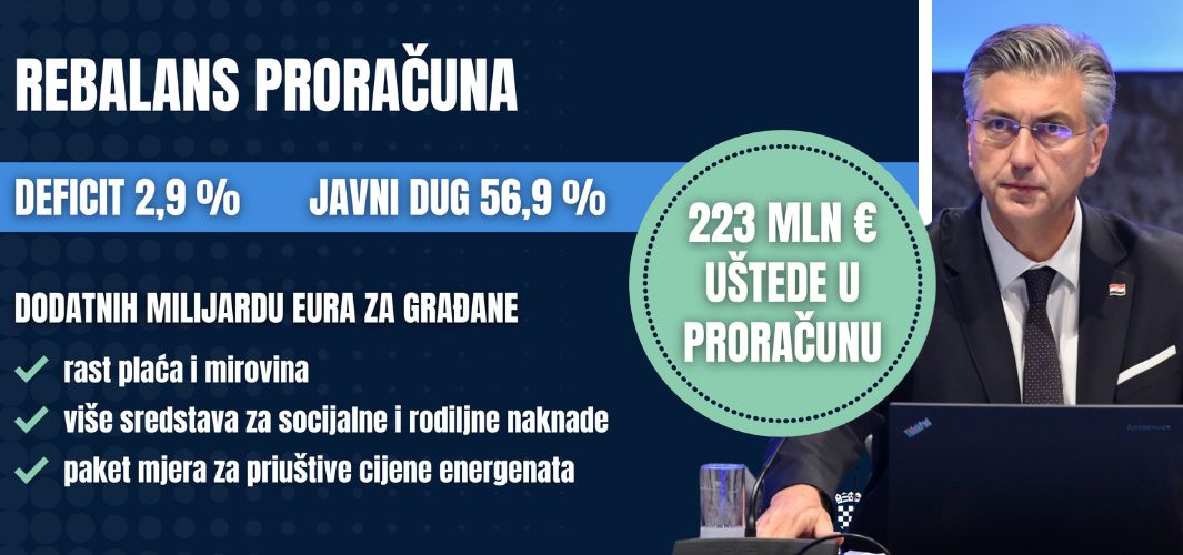 - Rebalansom smo izdvojili više od milijarde eura dodatnih sredstava za podizanje i zaštitu životnog standarda: veće plaće u javnoj i državnoj službi, veće mirovine i mirovinska primanja, veće socijalne i rodiljne naknade, a manje cijene plina i struje od onih tržišnih.