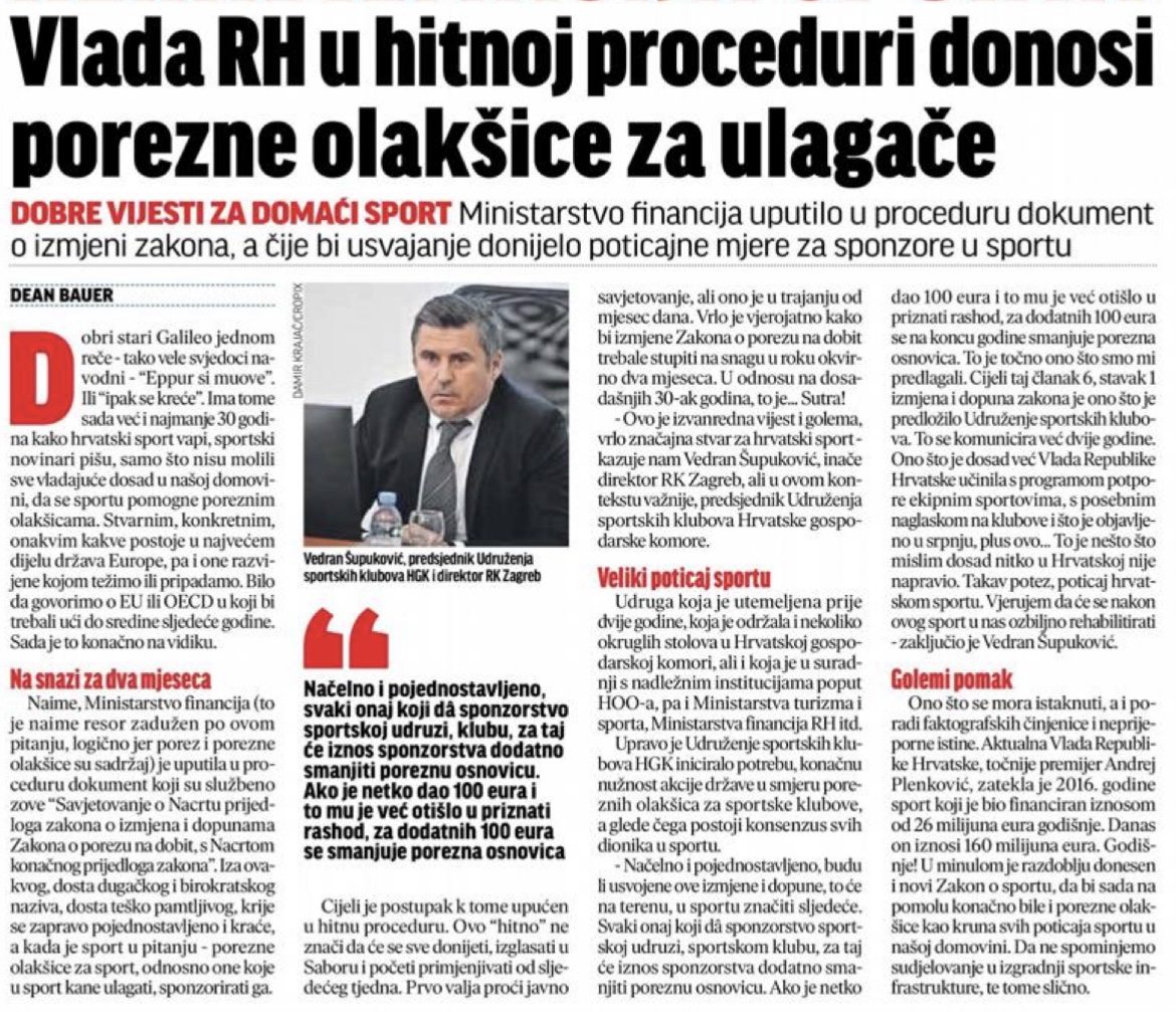 Porezne olakšice za sponzore sportskih klubova - dodatna injekcija hrvatskom sportu!