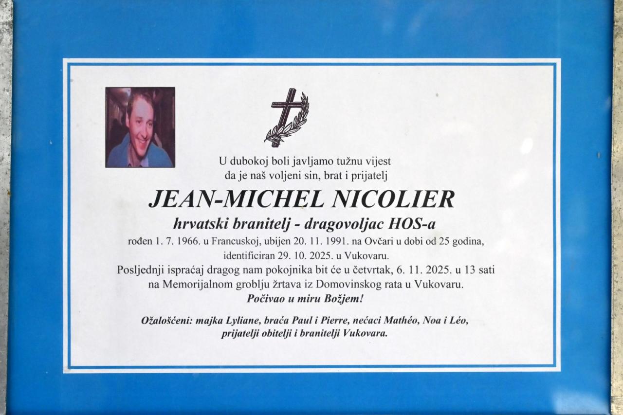 Posmrtni ostaci Jean-Michela Nicolier identificirani su 34 godine nakon što su ga, ranjenog i izvučenog iz vukovarske bolnice, svirepo mučili i na Ovčari likvidirali pripadnici tzv. JNA i četnici.
