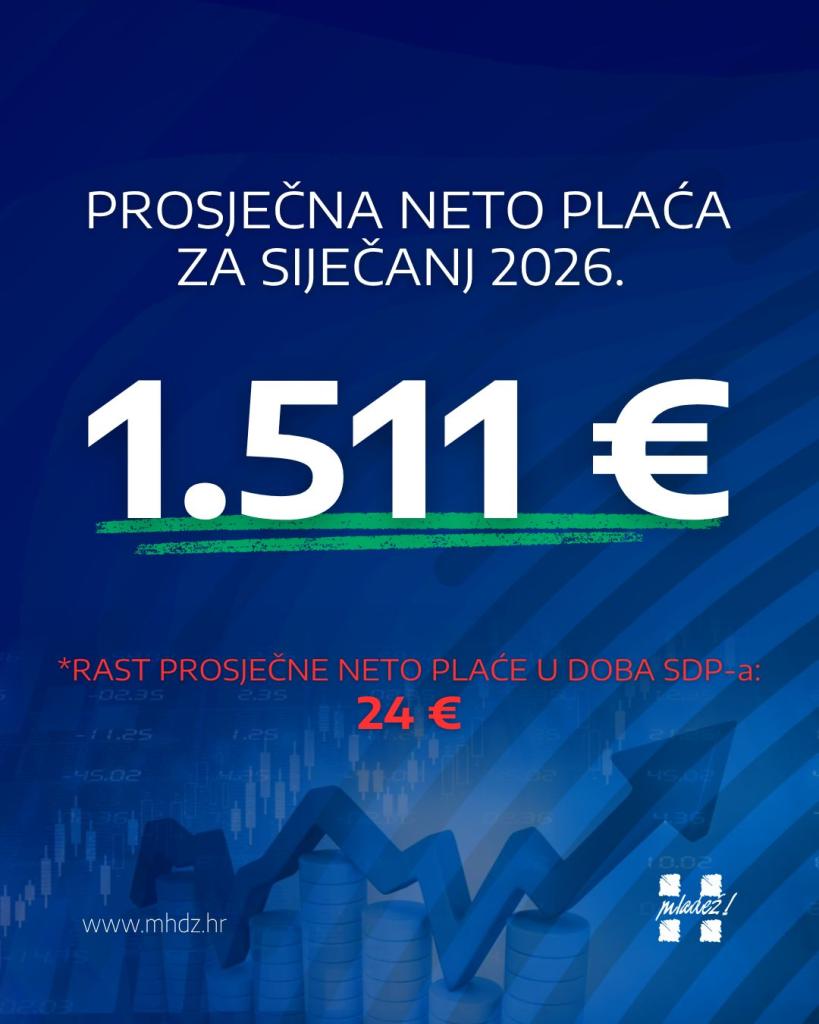 U našem mandatu porasla je za 762 €. A za vrijeme Milanovićeve, SDP-ove Vlade? Za - 24 €. Premijer Plenković: Od kada smo 2016. preuzeli ključeve Banskih dvora, prosječnu neto plaću nominalno smo povećali za 102%. Ako se oduzme inflacija, onda je REALNO viša za 47%! Plaće su porasle i u zadnjih godinu dana - nominalno za 8,5%, a REALNO za 5%. Medijalna neto plaća u siječnju 2026. iznosila je pak 1.304 €, što je za 8,7% više nego istoga lanjskog mjeseca, a za 1,9% nego u prosincu 2025. godine.