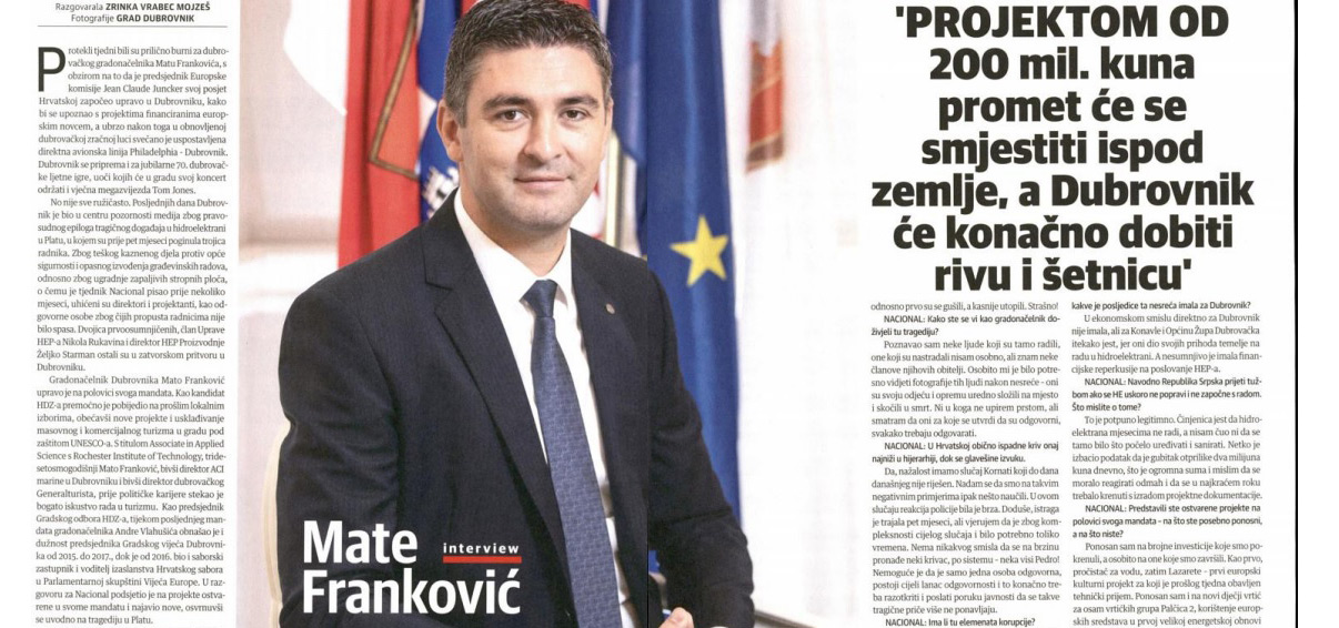 Gradonačelnik Dubrovnika Mato Franković upravo je na polovici svog mandata. Kao kandidat HDZ-a premoćno je pobijedio na prošlim lokalnim izborima, obećavši nove projekte i usklađivanje masovnog i komercijalnog turizma u gradu pod zaštitom UNESCO-a. S titulom Associate in Applied Science s Rochester Institute of Technology, tridesetosmogodišnji Mato Franković, bivši direktor ACI marine u Dubrovniku i bivši direktor dubrovačkog Generalturista, prije političke karijere stekao je bogato iskustvo rada u turizmu. Kao predsjednik Gradskog odbora HDZ-a, tijekom posljednjeg mandata gradonačelnika Andre Vlahušića, obnašao je i dužnost predsjednika Gradskog vijeća Dubrovnika od 2015. do 2017., dok je od 2016. bio i saborski zastupnik i voditelj izaslanstva Hrvatskog sabora u Parlamentarnoj skupštini Vijeća Europe. U razgovoru za Nacional podsjetio je na projekte ostvarene u svome mandatu i najavio nove.